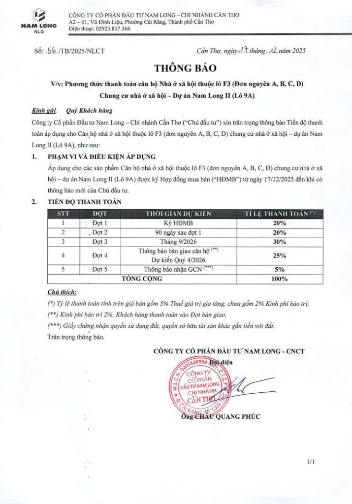Căn cứ thông báo của Công ty Cổ phần Đầu tư Nam Long – Chi nhánh Cần Thơ, chủ đầu tư dự án chung cư nhà ở xã hội thuộc dự án Nam Long II (lô 9A), quận Cái Răng, TP Cần Thơ đã ban hành phương thức thanh toán áp dụng cho các căn hộ nhà ở xã hội thuộc lô F3 (đơn nguyên A, B, C, D).
